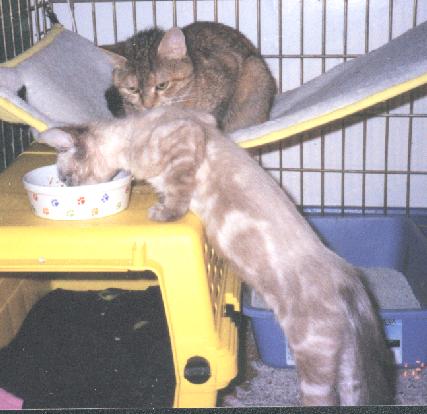 Hermes came later and was not immediatley accepted, but Ninga finally agreed that he was one of hers. The fist sign that Ninga accepted Hermes when when she let him eat out of her food dish. |